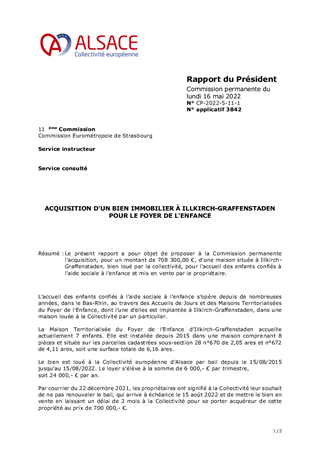 Le présent rapport a pour objet de proposer à la Commission permanente l'acquisition, pour un montant de 708 300,00 €, d'une maison située à Illkirch-Graffenstaden, bien loué par la collectivité, pour l'accueil des enfants confiés à l'aide sociale à l'enfance et mis en vente par le propriétaire.