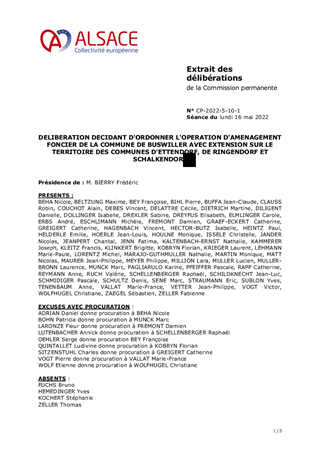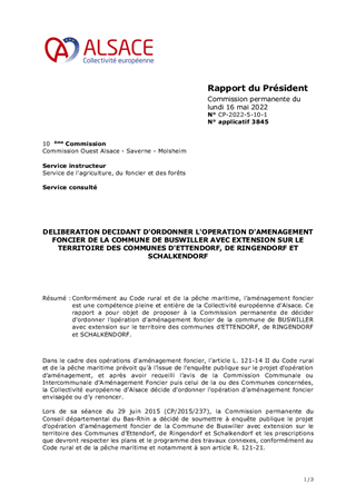 Conformément au Code rural et de la pêche maritime, l’aménagement foncier est une compétence pleine et entière de la Collectivité européenne d’Alsace. Ce rapport a pour objet de proposer à la Commission permanente de décider d’ordonner l’opération d’aménagement foncier de la commune de BUSWILLER avec extension sur le territoire des communes d’ETTENDORF, de RINGENDORF et SCHALKENDORF.