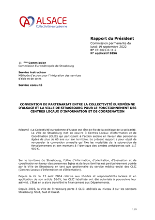 La Collectivité européenne d'Alsace est tête de file de la politique de la solidarité. La Ville de Strasbourg met en oeuvre 3 Centres Locaux d'Information et de Coordination (CLIC) qui participent à l'action sociale en faveur des personnes âgées de plus de 60 ans sur son territoire. Le présent rapport a pour objet de renouveler la convention annuelle qui fixe les modalités de la subvention de fonctionnement et son montant à l'identique des années précédentes soit 117 900 €.