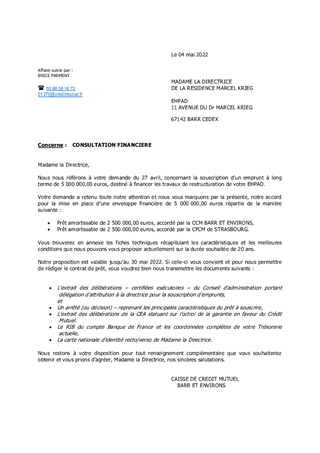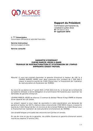 Il vous est proposé d’accorder la garantie d'emprunt à hauteur de 100 % à l’EHPAD MARCEL KRIEG pour deux emprunts d’un montant de 2 500 000 € chacun à souscrire auprès du Crédit Mutuel pour le financement de l’opération de restructuration et d’extension de l’EHPAD.
