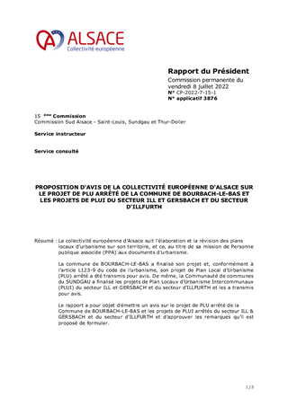La collectivité européenne d’Alsace suit l’élaboration et la révision des plans locaux d’urbanisme sur son territoire, et ce, au titre de sa mission de Personne publique associée (PPA) aux documents d’urbanisme. La commune de BOURBACH-LE-BAS a finalisé son projet et, conformément à l'article L123-9 du code de l’urbanisme, son projet de Plan Local d'Urbanisme (PLU) arrêté a été transmis pour avis. De même, la Communauté de communes du SUNDGAU a finalisé les projets de Plan Locaux d'Urbanisme Intercommunaux (PLUI) du secteur ILL et GERSBACH et du secteur d'ILLFURTH et les a transmis pour avis. Le rapport a pour objet d'émettre un avis sur le projet de PLU arrêté de la Commune de BOURBACH-LE-BAS et les projets de PLUI arrêtés du secteur ILL & GERSBACH et du secteur d'ILLFURTH et d’approuver les remarques qu’il est proposé de formuler.