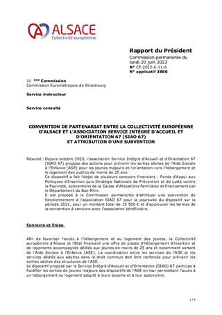 Depuis octobre 2020, l’association Service Intégré d’Accueil et d’Orientation 67 (SIAO 67) propose des actions pour prévenir les sorties sèches de l’Aide Sociale à l’Enfance (ASE) pour les jeunes majeurs et l’orientation vers l’hébergement et le logement des publics de moins de 25 ans. Ce dispositif a fait l’objet de plusieurs concours financiers : Fonds d’Appui aux Politiques d’Insertion puis Stratégie Nationale de Prévention et de Lutte contre la Pauvreté, subventions de la Caisse d’Allocations Familiales et financement par le Département du Bas-Rhin. Il est proposé à la Commission permanente d'attribuer une subvention de fonctionnement à l’association SIAO 67 pour la poursuite du dispositif sur la période 2021, pour un montant total de 15 500 € et d’approuver les termes de la convention à conclure avec l’association bénéficiaire.
