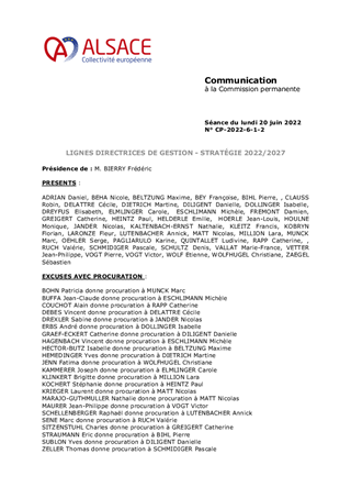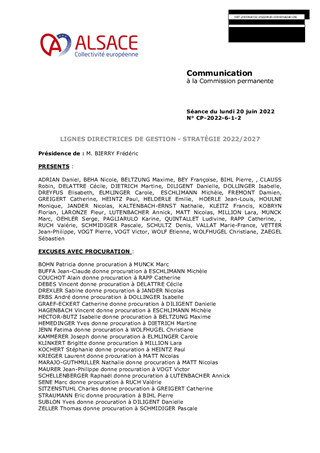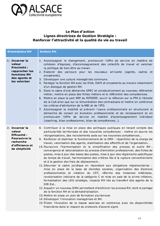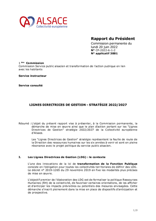 L'objet du présent rapport vise à présenter, à la Commission permanente, la démarche de mise en œuvre ainsi que le plan d’action portant sur les "Lignes Directrices de Gestion" stratégie 2022/2027 de la Collectivité européenne d’Alsace. Les "Lignes Directrices de Gestion" stratégie représentent la feuille de route de la Direction des ressources humaines sur les six années à venir et sont en pleine résonance avec le projet politique du service public alsacien.
