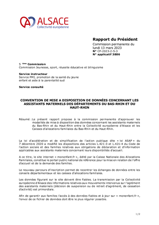 Le présent rapport propose à la commission permanente d’approuver les modalités de mise à disposition des données concernant les assistants maternels du Bas-Rhin et du Haut-Rhin entre la Collectivité européenne d’Alsace et les Caisses d’allocations familiales du Bas-Rhin et du Haut-Rhin.