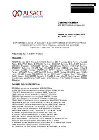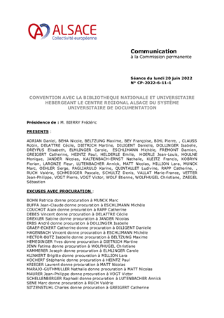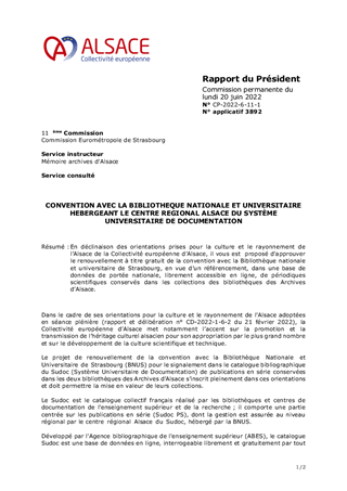 En déclinaison des orientations prises pour la culture et le rayonnement de l’Alsace de la Collectivité européenne d’Alsace, il vous est proposé d'approuver le renouvellement à titre gratuit de la convention avec la Bibliothèque nationale et universitaire de Strasbourg, en vue d’un référencement, dans une base de données de portée nationale, librement accessible en ligne, de périodiques scientifiques conservés dans les collections des bibliothèques des Archives d’Alsace.