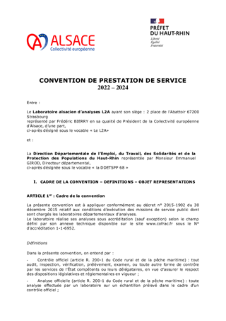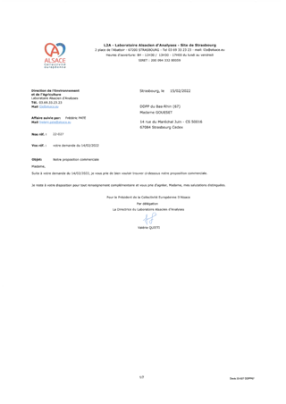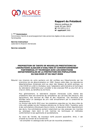 PROPOSITION DE TARIFS DE NOUVELLES PRESTATIONS DU LABORATOIRE ALSACIEN D'ANALYSES ET CONVENTIONNEMENT PARTENERIAL ET TECHNIQUE AVEC LES DIRECTIONS DEPARTEMENTALES DE LA PROTECTION DES POPULATIONS DU BAS-RHIN ET DU HAUT-RHIN
