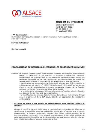 Le présent rapport a pour objet de vous proposer des mesures financières en faveur du personnel et en matière de moyens humains afin d’adapter l’organisation de la collectivité et les ressources nécessaires pour mener les politiques publiques de la CeA, développer ses compétences et rendre un service public efficace et de proximité aux Alsaciens soit plus précisément : - l’application au personnel de la Collectivité relevant des filières sociale et médico-sociale du décret n° 2022-728 du 28 avril 2022 relatif au versement d'une prime de revalorisation à certains personnels relevant de la fonction publique territoriale (extension du Ségur de la Santé), - la création et la suppression d'un certain nombre d'emplois afin de répondre aux besoins des services et à leur organisation, - la modification des critères d'attribution du Complément Indemnitaire Annuel auquel le personnel de la CeA peut prétendre en application de précédentes délibérations.