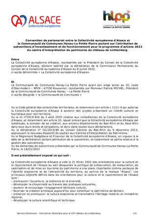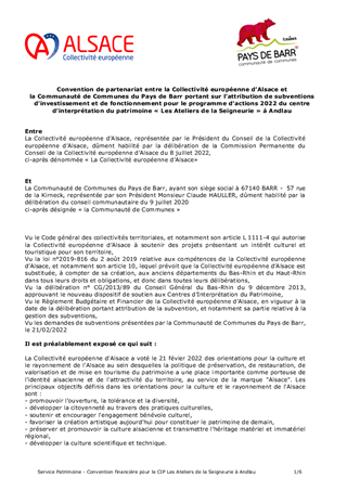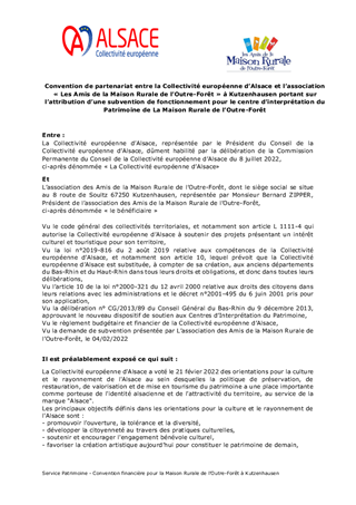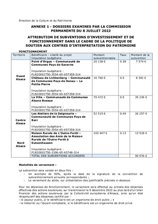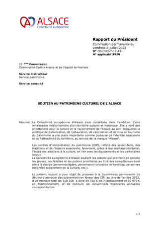 La Collectivité européenne d'Alsace s’est constituée dans l’ambition d’une renaissance institutionnelle d’un territoire culturel et historique. Elle a voté des orientations pour la culture et le rayonnement de l'Alsace au sein desquelles la politique de préservation, de restauration, de valorisation et de mise en tourisme du patrimoine a une place importante comme porteuse de l'identité alsacienne et de l'attractivité du territoire, au service de la marque "Alsace". Les centres d'interprétation du patrimoine (CIP), reflets des savoir-faire, des traditions et de l'histoire alsacienne, favorisent, grâce à leur maillage territorial, l'accès des alsaciens à la culture, en lien avec les équipements et les partenaires locaux. La Collectivité européenne d’Alsace soutient les actions qui prennent en compte les jeunes, les familles et les publics prioritaires au titre des compétences dont elle a la charge (personnes âgées, personnes en situation de handicap, personnes éloignées socialement de la culture, etc.). Le présent rapport a pour objet de proposer à la Commission permanente de décider d'attribuer des subventions en faveur des CIP, au titre de l'année 2022, d'un montant total de 110 308 € dont 19 332 € en investissement et 90 976 € en fonctionnement, et de conclure les conventions financières annuelles correspondantes.