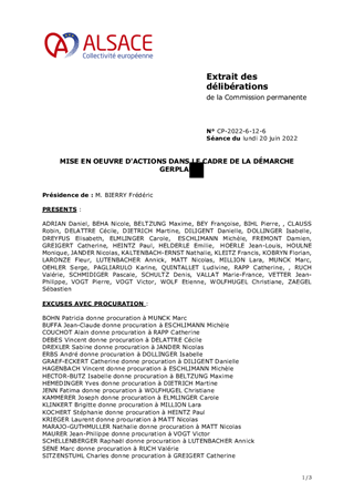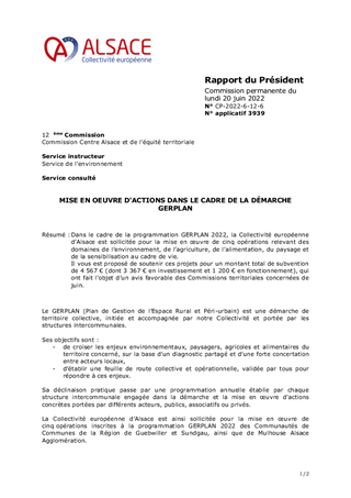 Dans le cadre de la programmation GERPLAN 2022, la Collectivité européenne d’Alsace est sollicitée pour la mise en œuvre de cinq opérations relevant des domaines de l’environnement, de l’agriculture, de l’alimentation, du paysage et de la sensibilisation au cadre de vie. Il vous est proposé de soutenir ces projets pour un montant total de subvention de 4 567 € (dont 3 367 € en investissement et 1 200 € en fonctionnement), qui ont fait l’objet d’un avis favorable des Commissions territoriales concernées de juin.