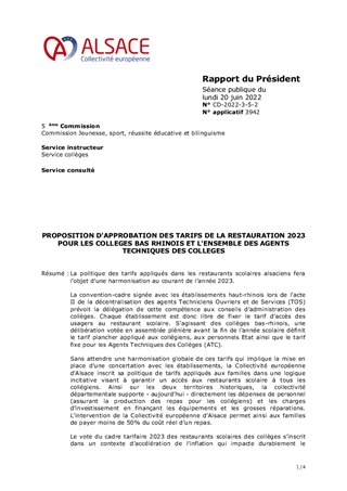 La politique des tarifs appliqués dans les restaurants scolaires alsaciens fera l’objet d’une harmonisation au courant de l’année 2023. La convention-cadre signée avec les établissements haut-rhinois lors de l’acte II de la décentralisation des agents Techniciens Ouvriers et de Services (TOS) prévoit la délégation de cette compétence aux conseils d’administration des collèges. Chaque établissement est donc libre de fixer le tarif d’accès des usagers au restaurant scolaire. S’agissant des collèges bas-rhinois, une délibération votée en assemblée plénière avant la fin de l’année scolaire définit le tarif plancher appliqué aux collégiens, aux personnels Etat ainsi que le tarif fixe pour les Agents Techniques des Collèges (ATC). Sans attendre une harmonisation globale de ces tarifs qui implique la mise en place d’une concertation avec les établissements, la Collectivité européenne d'Alsace inscrit sa politique de tarifs appliqués aux familles dans une logique incitative visant à garantir un accès aux restaurants scolaire à tous les collégiens. Ainsi sur les deux territoires historiques, la collectivité départementale supporte - aujourd’hui - directement les dépenses de personnel (assurant la production des repas pour les collégiens) et les charges d’investissement en finançant les équipements et les grosses réparations. L’intervention de la Collectivité européenne d’Alsace permet ainsi aux familles de payer moins de 50% du coût réel d’un repas. Le vote du cadre tarifaire 2023 des restaurants scolaires des collèges s’inscrit dans un contexte d’accélération de l’inflation qui impacte durablement le pouvoir d’achat des familles alsaciennes. Malgré l’envolée des prix des denrées alimentaires à laquelle doivent faire face les cantines scolaires, la Collectivité européenne d’Alsace souhaite maintenir pour l’année 2023 le cadre tarifaire actuel des établissements bas-rhinois, sans mesure de revalorisation des tarifs dans un contexte de préservation du pouvoir d’achat. Il est entendu que le cadre tarifaire des établissements haut-rhinois n’est pas soumis à évolution non plus, de la part de la Collectivité. Concernant les ATC, et dans une approche qui s’inscrit dans une logique d’équité de traitement et de préservation du pouvoir d’achat de ceux-ci, une première mesure d’harmonisation à l’échelle de l’Alsace du prix des repas est proposée par la fixation d’un tarif unique basé sur le tarif 2022 pratiqué dans le cadre tarifaire bas-rhinois sans mesure de revalorisation en 2023.