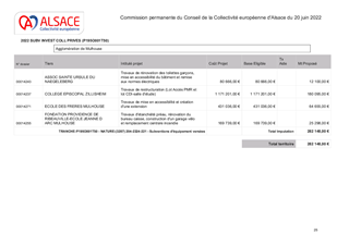 Le soutien aux dépenses d’investissement des collèges privés sous contrats d’association ne relève pas d’une obligation mais d’une possibilité qui est offerte, eu égard aux articles L.151-4 et L.442-16 du code de l’éducation. Le présent rapport a pour objet de proposer à la Commission Permanente de décider du montant de la subvention d’investissement à attribuer aux 19 établissements privés sous contrat ayant sollicité une participation financière de la Collectivité européenne d’Alsace, et ce, au titre des investissements réalisés en 2022.