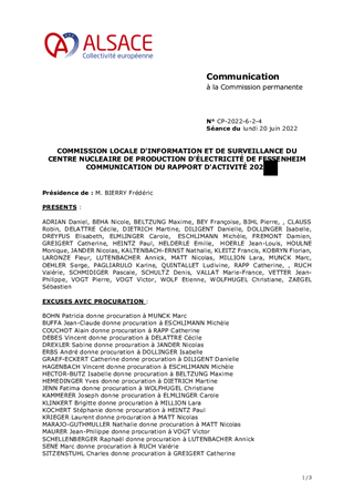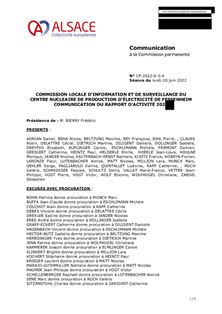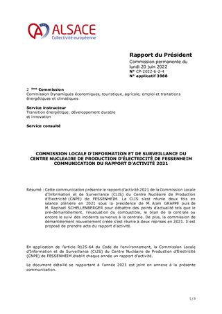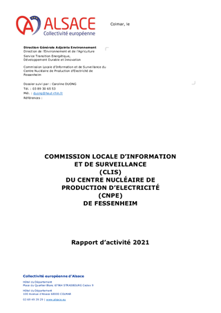 COMMISSION LOCALE D'INFORMATION ET DE SURVEILLANCE DU CENTRE NUCLEAIRE DE PRODUCTION D'ÉLECTRICITÉ DE FESSENHEIM COMMUNICATION DU RAPPORT D'ACTIVITÉ 2021