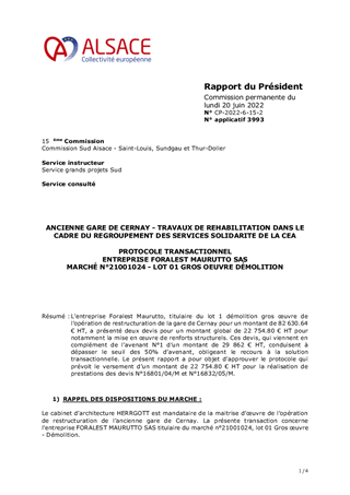 L’entreprise Foralest Maurutto, titulaire du lot 1 démolition gros œuvre de l’opération de restructuration de la gare de Cernay pour un montant de 82 630.64 € HT, a présenté deux devis pour un montant global de 22 754.80 € HT pour notamment la mise en œuvre de renforts structurels. Ces devis, qui viennent en complément de l’avenant N°1 d’un montant de 29 862 € HT, conduisent à dépasser le seuil des 50% d’avenant, obligeant le recours à la solution transactionnelle. Le présent rapport a pour objet d’approuver le protocole qui prévoit le versement d’un montant de 22 754.80 € HT pour la réalisation de prestations des devis N°16801/04/M et N°16832/05/M.