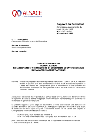 GARANTIE D'EMPRUNT DOMIAL SA HLM REHABILITATION THERMIQUE DE 24 LOGEMENTS LOCATIFS SOCIAUX RUE ANATOLE JACQUOT A THANN