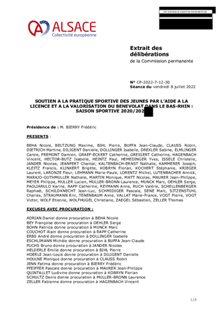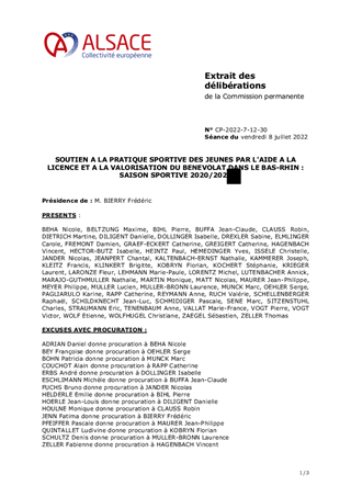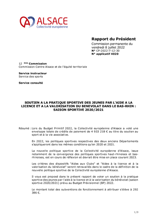 Lors du Budget Primitif 2022, la Collectivité européenne d’Alsace a voté une enveloppe totale de crédits de paiement de 4 933 218 € au titre du soutien au sport et à la vie associative. En 2022, les politiques sportives respectives des deux anciens Départements s’appliqueront dans les mêmes conditions qu’en 2020 et 2021. La nouvelle politique sportive de la Collectivité européenne d'Alsace, issue notamment de la convergence des politiques sportives haut-rhinoises et bas-rhinoises, est en cours de réflexion et devrait être mise en place courant 2023. Les critères des dispositifs "Aides aux Clubs" et "Aides à la licence et à la valorisation du bénévolat" seront retravaillés dans le cadre de la définition de la nouvelle politique sportive de la Collectivité européenne d'Alsace. Il vous est proposé dans le présent rapport de voter un soutien à la pratique sportive des jeunes par l'aide à la licence et à la valorisation du bénévolat (saison sportive 2020/2021) prévu au Budget Prévisionnel (BP) 2022. Le montant total des subventions de fonctionnement à attribuer s'élève à 292 386 €. La 5ème Commission Jeunesse, Sport, Réussite éducative et Bilinguisme, réunie le 1er juillet 2022, a donné un avis favorable à ce dossier.