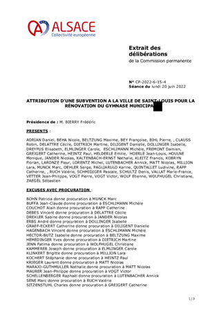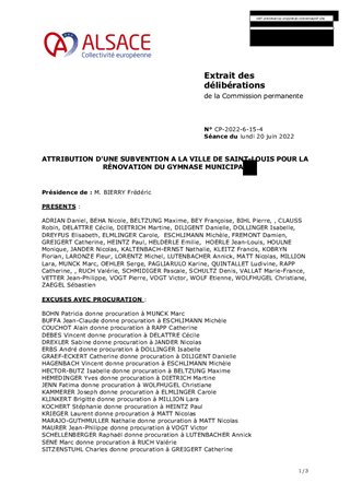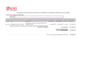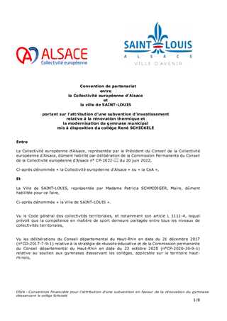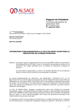 Le présent rapport propose d’attribuer à la Ville de SAINT-LOUIS une subvention d’investissement de 272 646 € pour la rénovation du gymnase municipal mis à disposition du collège Schickelé pour la pratique de l’éducation physique et sportive. La Commission à la jeunesse, au sport, à la réussite éducative et au bilinguisme réunie le 10 juin 2022 a donné un avis favorable à ce dossier.