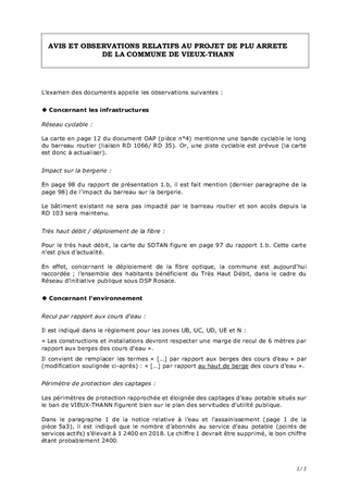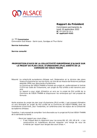 La collectivité européenne d’Alsace suit l’élaboration et la révision des plans locaux d’urbanisme sur son territoire, au titre de sa mission de Personne publique associée (PPA) aux documents d’urbanisme. La Commune de VIEUX-THANN a finalisé son projet et, conformément à l'article L123-9 du Code de l’Urbanisme, son projet de PLU arrêté a été transmis pour avis. Le rapport a pour objet d'émettre un avis sur le projet de PLU arrêté de la Commune de VIEUX-THANN et d’approuver les remarques qu’il est proposé de formuler.