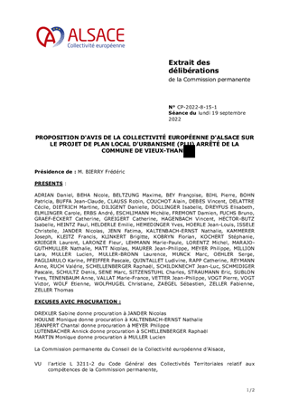 PROPOSITION D'AVIS DE LA COLLECTIVITÉ EUROPÉENNE D'ALSACE SUR LE PROJET DE PLAN LOCAL D'URBANISME (PLU) ARRÊTÉ DE LA COMMUNE DE VIEUX-THANN