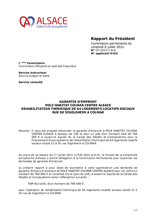 Il vous est proposé d’accorder la garantie d'emprunt à POLE HABITAT COLMAR CENTRE ALSACE à hauteur de 100 % pour un prêt d’un montant total de 768 000 € à souscrire auprès de la Caisse des Dépôts et Consignations pour le financement d'une opération de réhabilitation thermique de 64 logements locatifs sociaux situés 12 à 26 rue Sigolsheim à COLMAR.