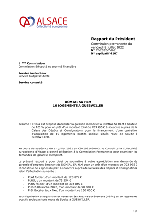 Il vous est proposé d’accorder la garantie d'emprunt à DOMIAL SA HLM à hauteur de 100 % pour un prêt d’un montant total de 703 995 € à souscrire auprès de la Caisse des Dépôts et Consignations pour le financement d'une opération d’acquisition de 10 logements locatifs sociaux situés route de Soultz à GUEBWILLER.