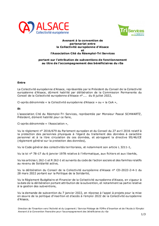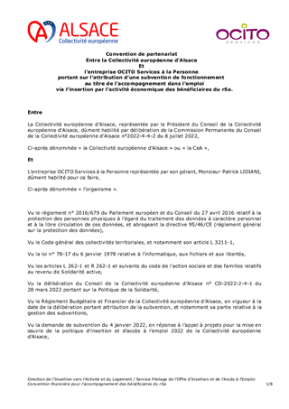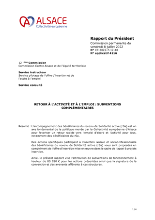 L’accompagnement des bénéficiaires du revenu de Solidarité active (rSa) est un axe fondamental de la politique menée par la Collectivité européenne d’Alsace pour favoriser un retour rapide vers l’emploi d’abord et l’activité pour tous, notamment des bénéficiaires du rSa. Des actions spécifiques participant à l’insertion sociale et socioprofessionnelle des bénéficiaires du revenu de Solidarité active (rSa) vous sont proposées en complément de l’offre d’insertion mise en œuvre dans le cadre de l’appel à projets insertion. Ainsi, le présent rapport vise l’attribution de subventions de fonctionnement à hauteur de 80 280 € pour les actions présentées ainsi que la signature de la convention et des avenants afférents à ces structures.