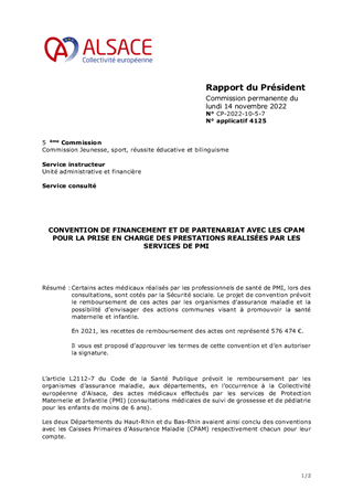 Certains actes médicaux réalisés par les professionnels de santé de PMI, lors des consultations, sont cotés par la Sécurité sociale. Le projet de convention prévoit le remboursement de ces actes par les organismes d’assurance maladie et la possibilité d’envisager des actions communes visant à promouvoir la santé maternelle et infantile. En 2021, les recettes de remboursement des actes ont représenté 576 474 €. Il vous est proposé d’approuver les termes de cette convention et d’en autoriser la signature.