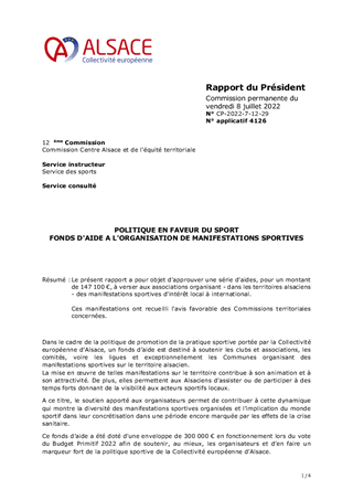 Le présent rapport a pour objet d'approuver une série d'aides, pour un montant de 147 100 €, à verser aux associations organisant - dans les territoires alsaciens - des manifestations sportives d'intérêt local à international. Ces manifestations ont recueilli l'avis favorable des Commissions territoriales concernées.