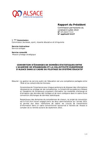 CONVENTION D'ÉCHANGES DE DONNÉES STATISTIQUES ENTRE L'ACADÉMIE DE STRASBOURG ET LA COLLECTIVITÉ EUROPÉENNE D'ALSACE DANS LE CADRE DU PILOTAGE DU SYSTÈME ÉDUCATIF