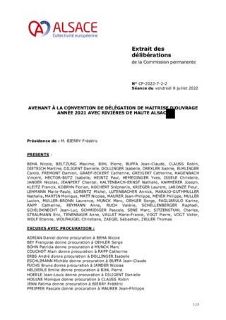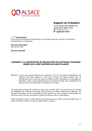 Il vous est proposé d’approuver l'avenant n°1 à la convention de délégation de maîtrise d'ouvrage signée en 2021 avec Rivières de Haute Alsace pour la maintenance semi-lourde du canal du Rhône au Rhin déclassé et les barrages du Haut-Rhin, suite à des ajustements de l'enveloppe initiale sans modification de cette dernière, et d'autoriser le Président à la signer.