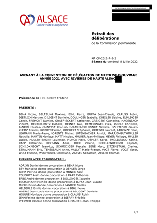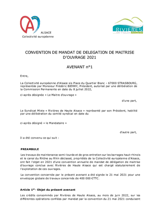 AVENANT À LA CONVENTION DE DÉLÉGATION DE MAITRISE D'OUVRAGE ANNÉE 2021 AVEC RIVIÈRES DE HAUTE ALSACE