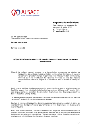 Le présent rapport propose à la Commission permanente de décider de l’acquisition de surfaces situées sur le ban communal de Bellefosse, et ce, dans le cadre d’un projet d’échange de parcelles avec l’Etat sur le ban communal du Hohwald et de la constitution des réserves foncières au titre des mesures compensatoires liées aux projets de la collectivité dans le massif du Champ du Feu.