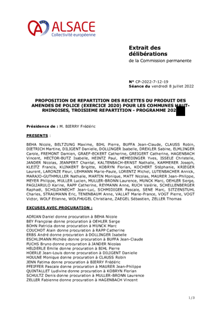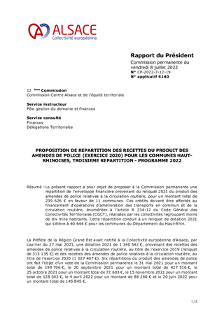 PROPOSITION DE REPARTITION DES RECETTES DU PRODUIT DES AMENDES DE POLICE (EXERCICE 2020) POUR LES COMMUNES HAUT-RHINOISES, TROISIEME REPARTITION - PROGRAMME 2022