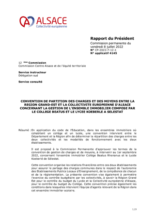 En application du code de l’Education, dans les ensembles immobiliers où cohabitent un collège et un lycée, une convention intervient entre le Département et la Région afin de déterminer la répartition des charges entre les deux collectivités et les modalités de fonctionnement avec les deux établissements. Il est proposé à la Commission Permanente d'approuver les termes de la convention de gestion de charges et de moyens, à intervenir au 1er septembre 2022, concernant l'ensemble immobilier Collège Beatus Rhenanus et le Lycée Koeberlé de Sélestat. Cette convention organise les relations financières entre ces deux établissements pour assurer le partage des charges communes dans le respect de l’autonomie des Etablissements Publics Locaux d'Enseignement, de la compétence de chacun et de la réglementation. La présente convention vise également à permettre l’exercice du contrôle budgétaire par les collectivités, à savoir la Région Grand Est pour le contrôle du budget du Lycée et la Collectivité européenne d'Alsace, pour le contrôle du budget du Collège. Cette convention précise également les conditions dans lesquelles intervient l’équipe d’agents relevant de la Région dans cet ensemble immobilier scolaire.