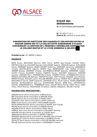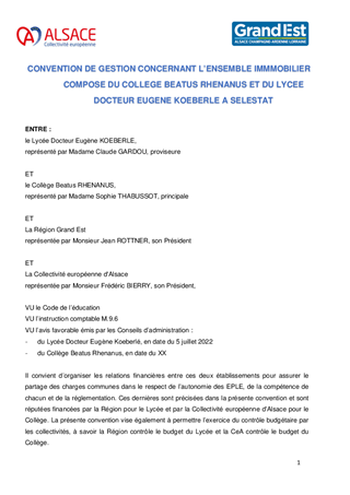 CONVENTION DE PARTITION DES CHARGES ET DES MOYENS ENTRE LA REGION GRAND-EST ET LA COLLECTIVITE EUROPEENNE D'ALSACE CONCERNANT LA GESTION DE L'ENSEMBLE IMMOBILIER COMPOSE PAR LE COLLEGE BEATUS ET LE LYCEE KOEBERLE A SELESTAT