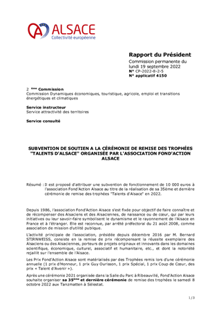 Il est proposé d'attribuer une subvention de fonctionnement de 10 000 euros à l'association Fond'Action Alsace au titre de la réalisation de sa 35ème et dernière cérémonie de remise des trophées "Talents d'Alsace" en 2022.