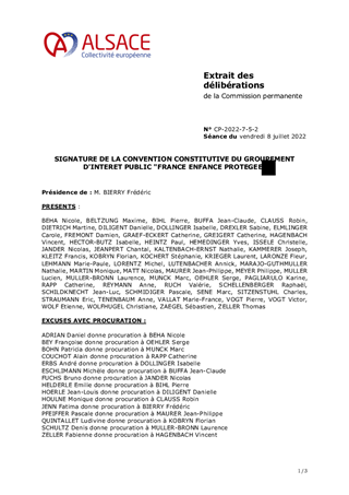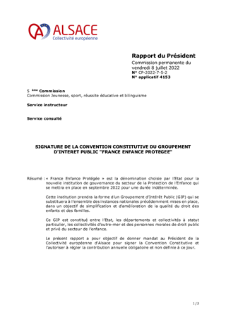 « France Enfance Protégée » est la dénomination choisie par l’Etat pour la nouvelle institution de gouvernance du secteur de la Protection de l’Enfance qui se mettra en place en septembre 2022 pour une durée indéterminée. Cette institution prendra la forme d’un Groupement d’Intérêt Public (GIP) qui se substituera à l’ensemble des instances nationales précédemment mises en place, dans un objectif de simplification et d'amélioration de la qualité du droit des enfants et des familles. Ce GIP est constitué entre l’Etat, les départements et collectivités à statut particulier, les collectivités d’outre-mer et des personnes morales de droit public et privé du secteur de l’enfance. Le présent rapport a pour objectif de donner mandat au Président de la Collectivité européenne d’Alsace pour signer la Convention Constitutive et l’autoriser à régler la contribution annuelle obligatoire et non définie à ce jour.