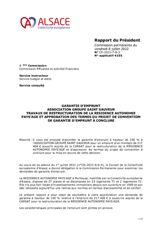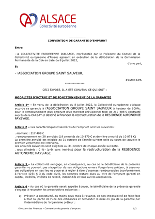 Il vous est proposé d’accorder la garantie d'emprunt à hauteur de 100 % à l'ASSOCIATION GROUPE SAINT SAUVEUR pour un emprunt d’un montant de 217 408 € souscrit auprès de la CARSAT pour la restructuration de la RÉSIDENCE AUTONOMIE PAYS’AGE et d’approuver les termes du projet de convention à conclure pour la mise en œuvre de cette décision.