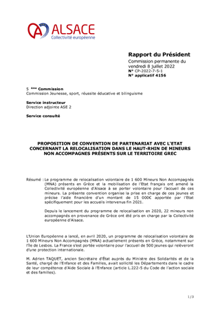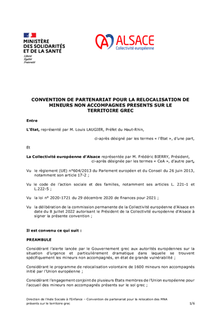 Le programme de relocalisation volontaire de 1 600 Mineurs Non Accompagnés (MNA) présents en Grèce et la mobilisation de l’Etat français ont amené la Collectivité européenne d’Alsace à se porter volontaire pour l’accueil de ces mineurs. La présente convention organise la prise en charge de ces jeunes et précise l’aide financière d'un montant de 15 000€ apportée par l’Etat spécifiquement pour les accueils intervenus fin 2021. Depuis le lancement du programme de relocalisation en 2020, 22 mineurs non accompagnés en provenance de Grèce ont été pris en charge par la Collectivité européenne d'Alsace.