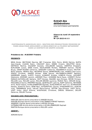 L’agriculture représente un enjeu majeur pour l’économie alsacienne, mais également pour l’aménagement, le dynamisme et la diversité du territoire. Les agriculteurs produisent nos aliments, entretiennent nos paysages, créent de l’emploi et contribuent à la vitalité de nos territoires ruraux. La politique agricole de la Collectivité européenne d’Alsace, menée en étroit partenariat avec la Chambre d’Agriculture Alsace, vise à promouvoir une agriculture alsacienne compétitive, durable, respectueuse de l'environnement, génératrice d’emplois et de richesses et s'inscrit dans un contrat cadre 2022-2024. Il est proposé de soutenir à hauteur de 10 000 € l’Association des producteurs fermiers de foie gras d’Alsace afin de mener une étude visant à augmenter la résilience de la filière alsacienne.