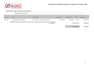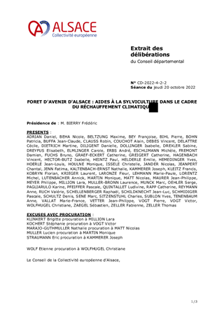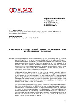 Le territoire alsacien détient une ressource en bois importante, tant en quantité que par la qualité de certaines essences. La Collectivité européenne d’Alsace, en menant une politique volontariste autour de la filière bois, souhaite rendre encore plus attractive cette filière de l’économie alsacienne. Il s’agit d’œuvrer à la pérennité et la durabilité de la forêt alsacienne en valorisant, dès lors qu’ils sont disponibles, les produits de construction issus de cette ressource locale. Cette valorisation va dans le sens de la démarche « Forêts d’Avenir d’Alsace », développée par la Collectivité européenne d’Alsace. Le Plan de Rebond a approuvé, le 31 mai 2021, le dispositif « Forêts d’Avenir d’Alsace » pour soutenir les communes forestières dans la régénération naturelle accompagnée par de la replantation et des protections contre les dégâts de gibier. L'objectif est de maintenir, voire d'accroître la présence de l'arbre dans les forêts alsaciennes. La forêt et le bois interviennent sur 3 leviers dans le cycle du carbone essentiels pour réussir la transition énergétique et climatique : la séquestration, le stockage et la substitution. La Collectivité européenne d’Alsace avec la Fédération Française du Bâtiment du Bas-Rhin et la Fédération du Bâtiment et des Travaux Publics du Haut-Rhin organisent les premières rencontres de la filière bois alsacienne le 21 octobre à la Maison du Bâtiment de Mulhouse et le 28 octobre à l’Hôtel de la Collectivité européenne d’Alsace de Strasbourg. Les objectifs sont de pouvoir échanger sur les marchés à venir et trouver les outils et méthodes permettant d'optimiser la filière à l'échelle alsacienne, de créer de la plus-value locale et de faciliter les appels d'offres comme la mise en œuvre. L’autorisation de programme prévoit 1 million d’euros sur la période 2021-2023. Une première édition 2021 a permis d’attribuer des subventions d’investissement aux communes forestières et aux syndicats forestiers pour un montant total de 322 289 euros pour plus de 100 hectares de forêts et près de 40 000 arbres plantés en complément de la régénération. Cette deuxième édition 2022 prévoit d’attribuer des subventions d'investissement pour un montant total de 357 099 euros pour plus de 91 hectares de forêts et près de 39 000 arbres plantés en complément de la régénération.