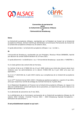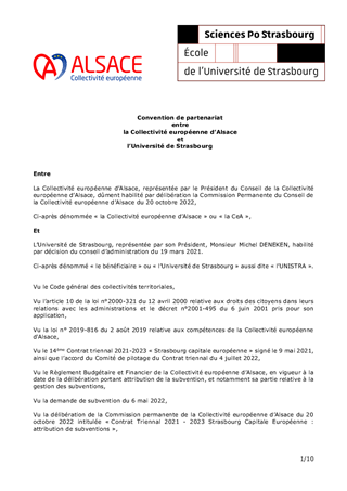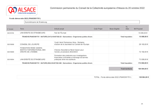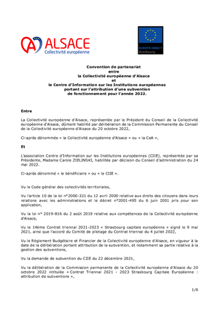 La Collectivité européenne d'Alsace est fortement engagée dans la défense de l’ambition que porte Strasbourg en tant que capitale européenne, à la fois siège des institutions européennes, cœur historique et politique de l’Europe et ville internationale des Droits de l’Homme, et plus globalement engagée dans le rayonnement de l'Alsace en Europe et la promotion des valeurs européennes et humanistes en Alsace. Dans le cadre du 14ème Contrat Triennal Strasbourg Capitale Européenne 2021-2023, signé le 9 mai 2021 en présence du Président de la République, de la Présidente de la Commission européenne et du Président du Parlement européen, les signataires (Préfecture, Région Grand Est, Collectivité européenne d’Alsace, Eurométropole et Ville de Strasbourg) ont souhaité mettre en place une nouvelle gouvernance permettant un meilleur suivi du Contrat. Ainsi, trois fonds de soutien fonctionnant sur un système d'appels à projets ont été créés dans les domaines de la recherche et de l'innovation, de la culture et de la démocratie afin de susciter de nouvelles initiatives de nature à renforcer le rayonnement européen de Strasbourg. Un autre dispositif concernant l'Agora Strasbourg Capitale européenne a été mis en place, ainsi qu’un soutien à un ensemble de projets structurants visant notamment à améliorer l’accessibilité multimodale de Strasbourg et à renforcer l’attractivité européenne et internationale de la capitale alsacienne. La Collectivité européenne d'Alsace a souhaité que les projets retenus soutiennent non seulement la dimension européenne de Strasbourg mais qu'ils puissent également participer au rayonnement global de l'Alsace et son inscription dans le bassin rhénan. Ce rapport propose d'attribuer des subventions de fonctionnement aux projets retenus dans le cadre du système d'appels à projets d'une part, et aux autres actions structurantes inscrites au Contrat triennal d'autre part, pour un montant total de 753 224 €. Le solde des différents fonds après vote de cette première série d’aides sera le suivant : - Fonds Culture = 756 101 € - Fonds Démocratie = 4 329 525 € - Fonds Recherche et Innovation = 1 000 000 € - Dispositif Agora = 275 046 €.