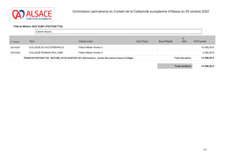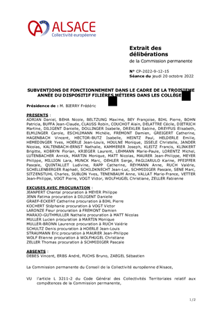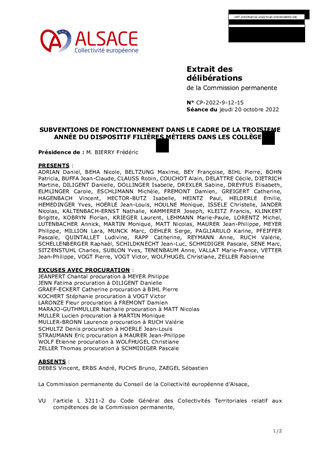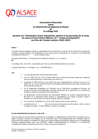 Un collégien connait en moyenne 10 à 20 métiers qui conditionneront ses choix en matière d’orientation. Ce constat est alarmant sur l’avenir des jeunes qui se construit « par défaut », « par dépit », « faute de mieux ». L’anticipation et la nécessité d’accroitre la connaissance du panel métier sont donc primordiales. Depuis la rentrée 2018, les collèges Grégoire de Tours à Marlenheim et Frison-Roche à La Broque mènent une expérimentation visant à faire découvrir aux collégiens les métiers d’excellence ou à fort potentiel de recrutement. Par une thématique forte, choisie, un ensemble d’élèves se mobilisent plusieurs heures par mois pour découvrir des métiers, échanger avec des professionnels effectuer des visites d’entreprises ou d’artisans. La Collectivité les accompagne par un soutien financier dans la mise en œuvre de cette démarche. Au vu d’un premier bilan très positif de ces actions, la Collectivité a, lors de sa séance du 9 décembre 2019 (délibération n°CD/2019/099), approuvé le lancement d’un appel à projets afin d’élargir le dispositif à d’autres collèges volontaires. Dix collèges ont ainsi été sélectionnés et ont pu intégrer dès la rentrée 2020/2021 ce dispositif "Filières métiers", prévu sur 3 ans. Le présent rapport a pour objet de proposer à la Commission permanente d’attribuer un soutien financier aux collèges porteurs de ces actions pour l’année 3 du dispositif. Le montant total des subventions de fonctionnement proposées est de 37 140 €. Au regard des récentes annonces ministérielles relatives à l’orientation des collégiens, s’agissant notamment de la proposition que des collèges volontaires organisent des activités de découverte des métiers à partir de la classe de cinquième et tout au long du cycle 4 (visites d'entreprises, mini-stages, rencontres avec des professionnels de différents secteurs d'activité, etc.), ce dispositif des « Filières Métiers » a vocation à être renforcé et élargi à l’échelle alsacienne dans le courant de l’année 2023. A cet effet, un lancement officiel pourra être co-porté par la Collectivité et l’Education Nationale.
