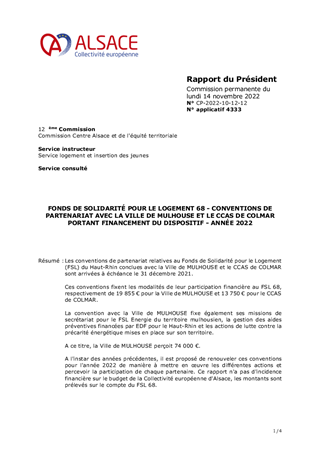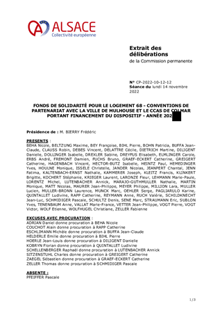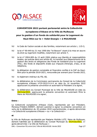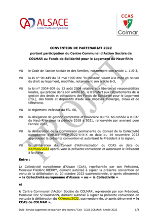 Les conventions de partenariat relatives au Fonds de Solidarité pour le Logement (FSL) du Haut-Rhin conclues avec la Ville de MULHOUSE et le CCAS de COLMAR sont arrivées à échéance le 31 décembre 2021. Ces conventions fixent les modalités de leur participation financière au FSL 68, respectivement de 19 855 € pour la Ville de MULHOUSE et 13 750 € pour le CCAS de COLMAR. La convention avec la Ville de MULHOUSE fixe également ses missions de secrétariat pour le FSL Energie du territoire mulhousien, la gestion des aides préventives financées par EDF pour le Haut-Rhin et les actions de lutte contre la précarité énergétique mises en place sur son territoire. A ce titre, la Ville de MULHOUSE perçoit 74 000 €. A l'instar des années précédentes, il est proposé de renouveler ces conventions pour l'année 2022 de manière à mettre en œuvre les différentes actions et percevoir la participation de chaque partenaire. Ce rapport n'a pas d'incidence financière sur le budget de la Collectivité européenne d'Alsace, les montants sont prélevés sur le compte du FSL 68.