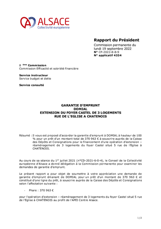 Il vous est proposé d’accorder la garantie d'emprunt à DOMIAL à hauteur de 100 % pour un prêt d’un montant total de 370 963 € à souscrire auprès de la Caisse des Dépôts et Consignations pour le financement d'une opération d’extension – réaménagement de 3 logements du foyer Castel situé 5 rue de l’Eglise à CHATENOIS.