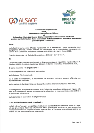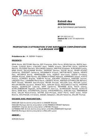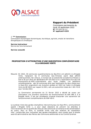 En 2022, 30 communes supplémentaires du Bas-Rhin ont adhéré à la Brigade Verte, rejoignant les 8 communes bas-rhinoises ayant déjà adhéré antérieurement. Par ailleurs, le Conseil de la Collectivité européenne d’Alsace a fixé le 20 juin 2022 par délibération N° CD-2022-3-2-1 l’application d’un taux de financement de 40% uniformément pour toute l’Alsace. Les adhésions complémentaires des 30 communes ainsi que l'application du taux d'aide pour le Haut-Rhin engendrent une évolution globale en 2022 de l'aide à la Brigade Verte de 88 948 € par rapport à 2021, soit une subvention totale de 1 601 411€ pour l'année 2022. La Commission permanente du 21 février 2022 a décidé de verser par anticipation une première subvention de fonctionnement de 604 985 € à la Brigade Verte. Il est par conséquent proposé d'accorder une subvention de fonctionnement complémentaire de 996 426 €.