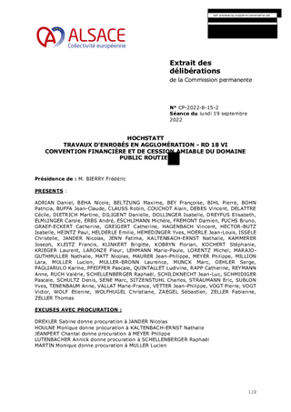 HOCHSTATT TRAVAUX D'ENROBÉS EN AGGLOMÉRATION - RD 18 VI CONVENTION FINANCIÈRE ET DE CESSION AMIABLE DU DOMAINE PUBLIC ROUTIER