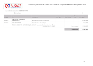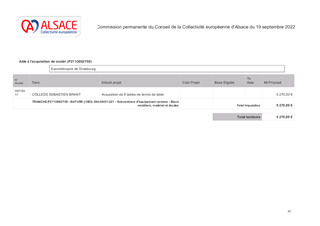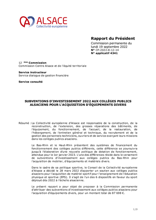 La Collectivité européenne d’Alsace est responsable de la construction, de la reconstruction, de l'extension, des grosses réparations des bâtiments, de l'équipement, du fonctionnement, de l’accueil, de la restauration, de l’hébergement, de l’entretien général et technique, du recrutement et de la gestion des personnels techniciens, ouvriers et de service exerçant leurs missions dans les collèges publics alsaciens. Le Bas-Rhin et le Haut-Rhin présentent des systèmes de financement du fonctionnement des collèges publics différents, cette différence se poursuivra jusqu’à l’élaboration d’une nouvelle politique de dotation de fonctionnement, attendue pour le 1er janvier 2023. L’une des différences réside dans le versement de subventions d’investissement aux collèges publics du Bas-Rhin pour l’acquisition de mobilier, d’équipements et matériels divers. Dans le cadre de sa politique sportive, le Conseil de la Collectivité européenne d’Alsace a décidé le 28 mars 2022 d’apporter un soutien aux collèges publics alsaciens pour l’acquisition de matériel sportif pour l’enseignement de l’éducation physique et sportive (EPS). Il s’agit de l’un des 6 dispositifs en faveur du sport déployé dès 2022 à l’échelle alsacienne. Le présent rapport a pour objet de proposer à la Commission permanente d’attribuer des subventions d'investissement aux collèges publics alsaciens pour l'acquisition d'équipements divers, pour un montant total de 87 698 €.