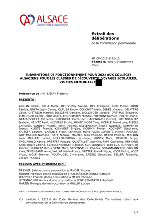 SUBVENTIONS DE FONCTIONNEMENT POUR 2022 AUX COLLÈGES ALSACIENS POUR LES CLASSES DE DÉCOUVERTE, VOYAGES SCOLAIRES, VISITES MÉMORIELLES
