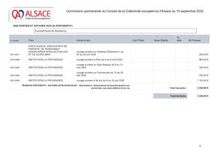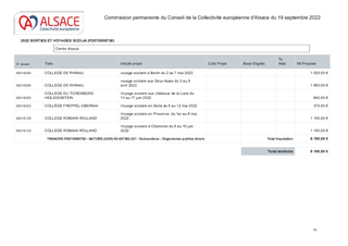 La politique éducative de la Collectivité européenne d’Alsace joue un rôle fondamental de socialisation et d'ouverture sur le monde des jeunes alsaciens. Elle finance le fonctionnement des collèges publics et privés et attribue des subventions pour les voyages et sorties scolaires organisés par les collèges et écoles publics et privés, selon des modalités de participation à ce jour différentes entre le Bas-Rhin et le Haut-Rhin. Celles-ci se poursuivront jusqu’à l’élaboration d’une nouvelle politique de participation aux voyages et sorties scolaires. Au 8 juillet 2022, un total cumulé de 124 753 € de subvention de fonctionnement ont été attribuées dans le cadre des voyages et sorties scolaires vers les lieux de mémoire alsaciens des collèges publics et privés du Bas-Rhin (7 607 élèves – 90 sorties et voyages scolaires) et de 116 270 € dans le cadre de sorties scolaires avec nuitées pour les collèges et les écoles publics et privés du Haut-Rhin (3 115 élèves – 71 sorties scolaires avec nuitées). Ce rapport propose l’attribution de subventions de fonctionnement complémentaires pour un montant total de 34 890 € dans le cadres de voyages et sorties scolaires vers les lieux de mémoire alsaciens des collèges publics et privés du Bas-Rhin (1828 élèves - 34 sorties et voyages scolaires).