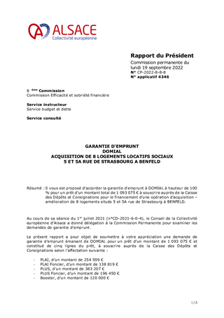 Il vous est proposé d’accorder la garantie d'emprunt à DOMIAL à hauteur de 100 % pour un prêt d’un montant total de 1 093 075 € à souscrire auprès de la Caisse des Dépôts et Consignations pour le financement d'une opération d’acquisition – amélioration de 8 logements situés 5 et 5A rue de Strasbourg à BENFELD.